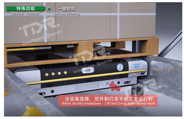當(dāng)使用救援車救援穿梭板時(shí),如穿梭板處于重載狀態(tài),則很難將穿梭板帶貨物一起拖出,通過此功能,一鍵即可將托盤放置到軌道上,直接將穿梭板拉出即可。