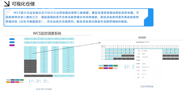 可視化:系統(tǒng)展示倉(cāng)庫(kù)平面視圖,實(shí)時(shí)展示倉(cāng)庫(kù)貨位變化和設(shè)備運(yùn)行狀態(tài)。